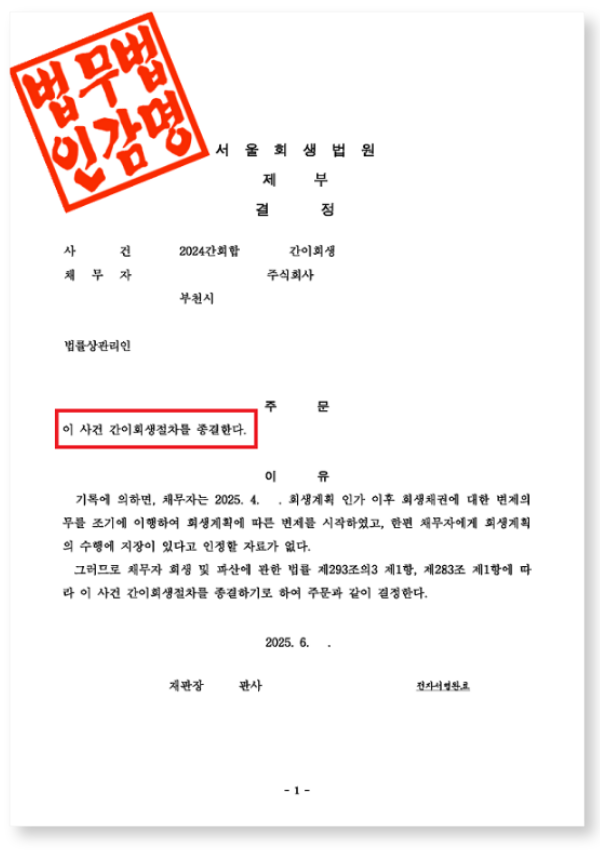 이에 따라 서울회생법원은 간이회생절차에 대해 종결결정을 내렸고,